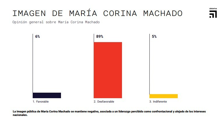 Asimismo, el sondeo, realizado el 10 de octubre, muestra que la mayoría de los encuestados asocia a Machado con un liderazgo confrontacional, alejado de los intereses nacionales.
