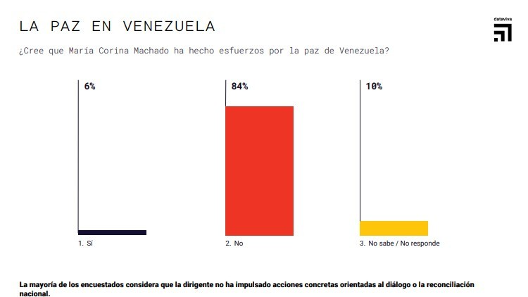 Por otro lado, el sondeo profundizó en la percepción ciudadana sobre el papel de Machado en el contexto nacional, revelando que el 84% de los encuestados considera que no ha realizado esfuerzos genuinos por la paz en Venezuela.