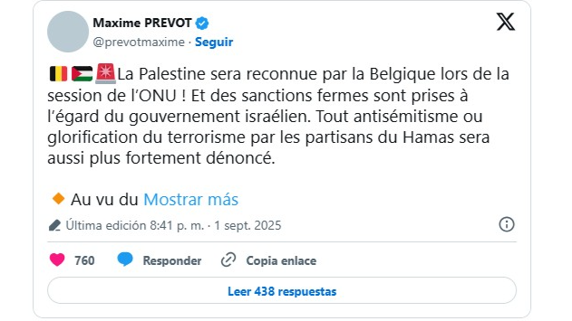 Por otra parte, Prevot afirmó que la decisión responde a la grave crisis humanitaria en Palestina, con especial énfasis en Gaza. En este marco, el primer ministro belga, Bart De Wever, ha señalado que cualquier reconocimiento debe estar sujeto a criterios estrictos, lo que refleja un equilibrio entre las responsabilidades humanitarias y las consideraciones de seguridad y política exterior.