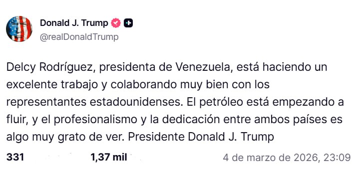 Cabe destacar que este pronunciamiento de Rodríguez surge tras un mensaje publicado previamente por el presidente Trump en la red social Truth Social, donde reconoció y aplaudió la labor que Delcy Rodríguez viene desempeñando como presidenta encargada de Venezuela, afirmando textualmente que la funcionaria «está haciendo un excelente trabajo».