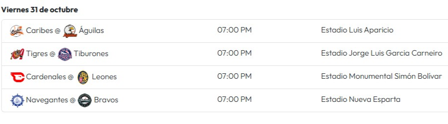 La Liga Venezolana de Béisbol Profesional (LVBP) continúa con la acción de su tercera semana de campeonato. Para la jornada de este viernes 31 de octubre, están pautados cuatro compromisos que prometen emociones en distintos escenarios del país. Todos los encuentros de esta noche son a partir de las 7:00 de la noche.