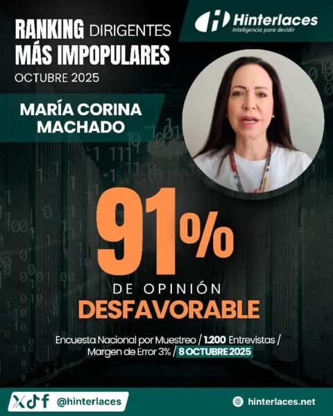 Un reciente estudio de la encuestadora Hinterlaces, que se divulgó el 8 de octubre de 2025, revela que María Corina Machado es la figura política con mayor rechazo en Venezuela, con 91 % de opiniones desfavorables entre los venezolanos consultados.