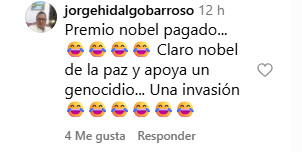 Las críticas también adoptaron un tono político y de burla, especialmente en referencia al Premio Nobel de la Paz que ganó la opositora, reflejando el contexto de polarización política: «La Guasona Nobel de la Guerra y la Invasión. Ahí ta!» y «Premio nobel pagado… Claro nobel de la paz y apoya un genocidio… Una invasión». Para finalizar, algunos usuarios recurrieron al humor religioso en alusión a las recientes canonizaciones de los dos santos venezolanos: «Dios nos bendiga y proteja de esa maldad!» y «Menos mal que ahora tenemos dos Santos para que nos protejan de todo mal».