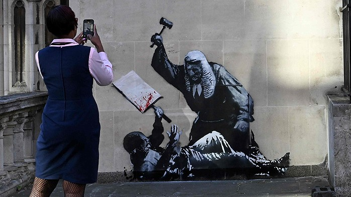 Un nuevo mural atribuido al artista Banksy apareció el lunes en la fachada del Royal Courts of Justice, en el centro de Londres, y rápidamente encendió la polémica. La obra, en el característico blanco y negro del artista con toques de rojo, mostraba a un juez con toga y peluca golpeando con un mazo a un manifestante tendido que sostenía una pancarta ensangrentada. Banksy confirmó la autoría en sus redes, pero horas después el tribunal lo cubrió con paneles opacos y desplegó vigilancia discreta en la zona.