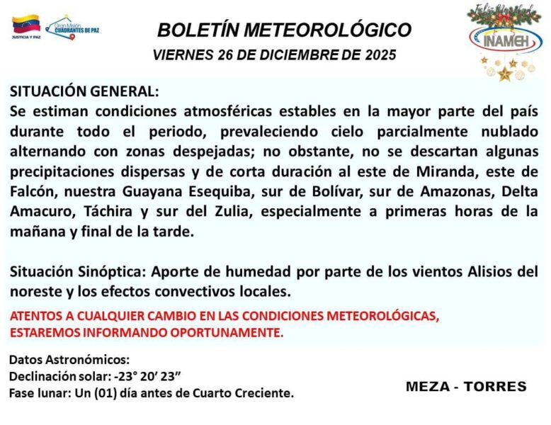 Se estiman condiciones atmosféricas estables en la mayor parte del país durante todo el periodo, al prevalecer cielo parcialmente nublado alternando con zonas despejadas, informó el boletín de las autoridades del Instituto Nacional de Meteorología e Hidrología (Inameh).