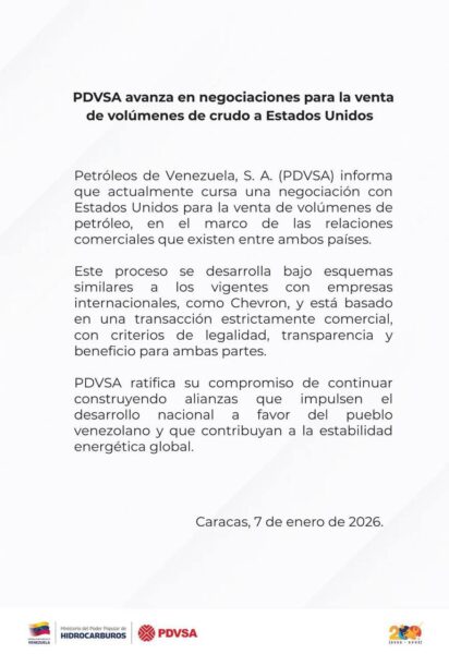 Petróleos de Venezuela, S.A. (PDVSA) anunció este miércoles que ha iniciado formalmente un proceso de negociación con el Gobierno de los Estados Unidos para la venta de volúmenes de crudo, con el objetivo de robustecer el intercambio comercial entre ambas naciones y contribuir a la seguridad del mercado energético internacional.