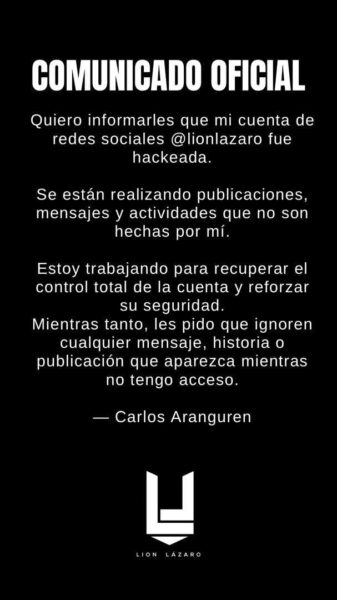 Lion Lázaro agradeció el apoyo y reiteró que cualquier información oficial será divulgada únicamente cuando retome el manejo de sus redes.