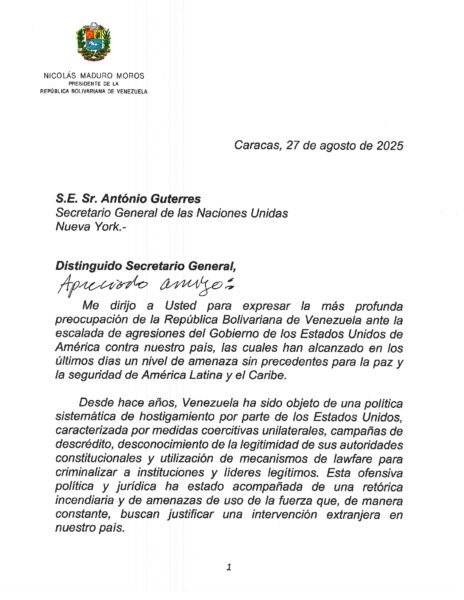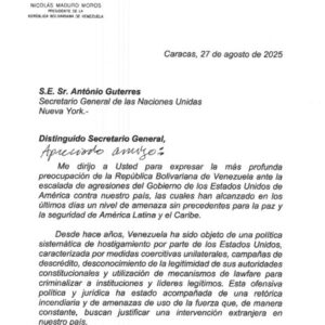 El presidente de la República, Nicolás Maduro, envió una carta al secretario general de la Organización de Naciones Unidas (ONU), Antonio Guterres, en la que solicitó un pronunciamiento urgente frente a lo que calificó como una “escalada hostil” de Estados Unidos contra Venezuela, marcada por el despliegue de buques militares y un submarino nuclear en el Caribe.