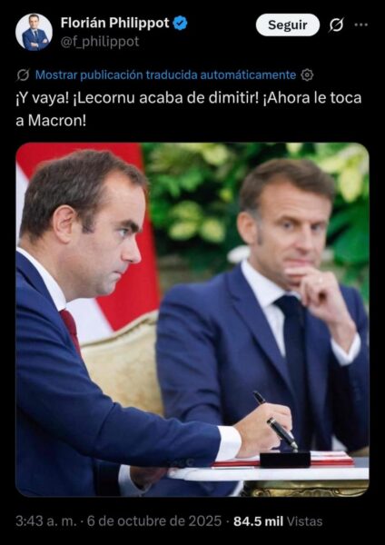 Al respecto, Mathilde Panot, líder de Francia Insumisa (LFI), recordó que a mediados de septiembre unos 104 diputados firmaron una moción para destituir al presidente y aseguró en X que “la cuenta regresiva ha comenzado”: “Lecornu dimite. Tres primeros ministros han sido derrotados en menos de un año. Macron debe irse”, afirmó.