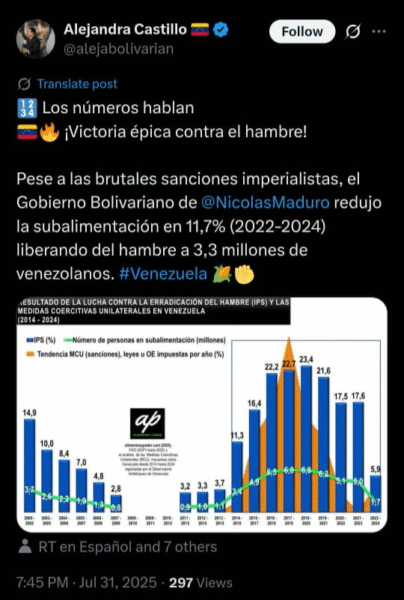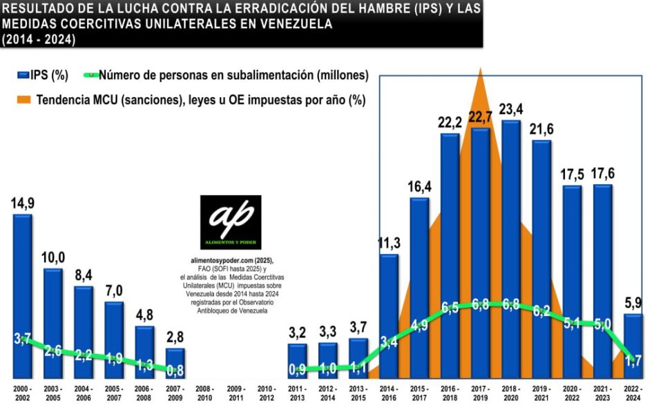 El informe también destaca que en 2006, durante el gobierno de Hugo Chávez, la erradicación del hambre fue una prioridad, logrando en ese entonces que Venezuela saliera del mapa mundial del hambre. Sin embargo, las medidas coercitivas unilaterales, especialmente hasta 2019, hicieron que la problemática resurgiera y se convirtiera en una preocupación social.